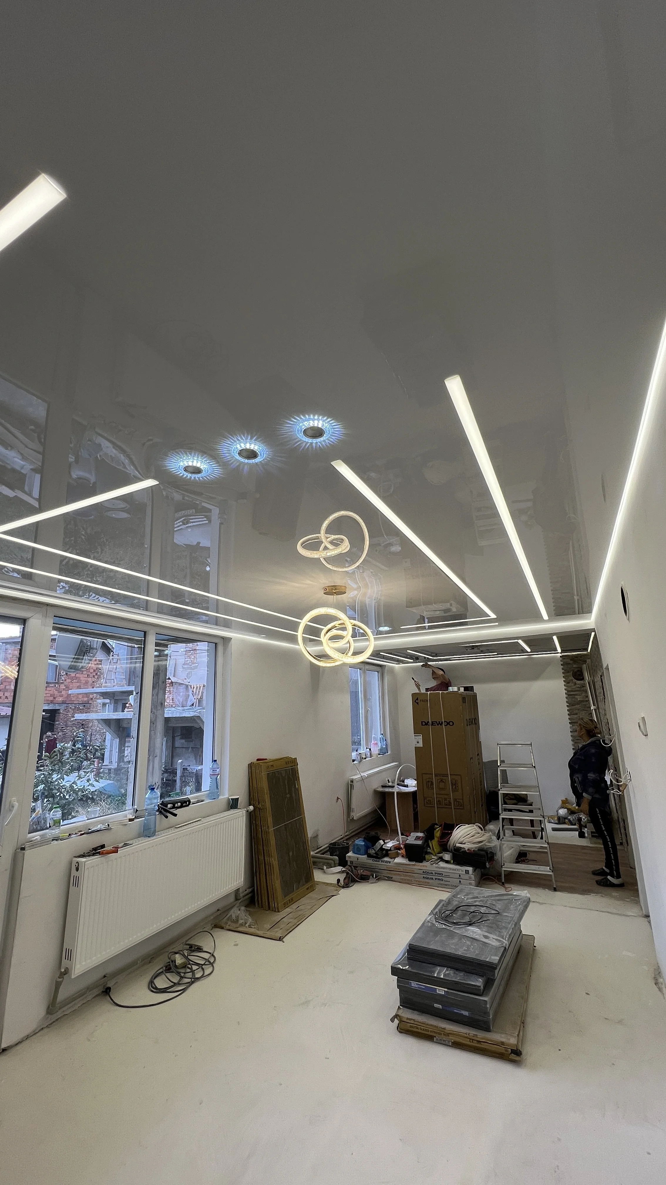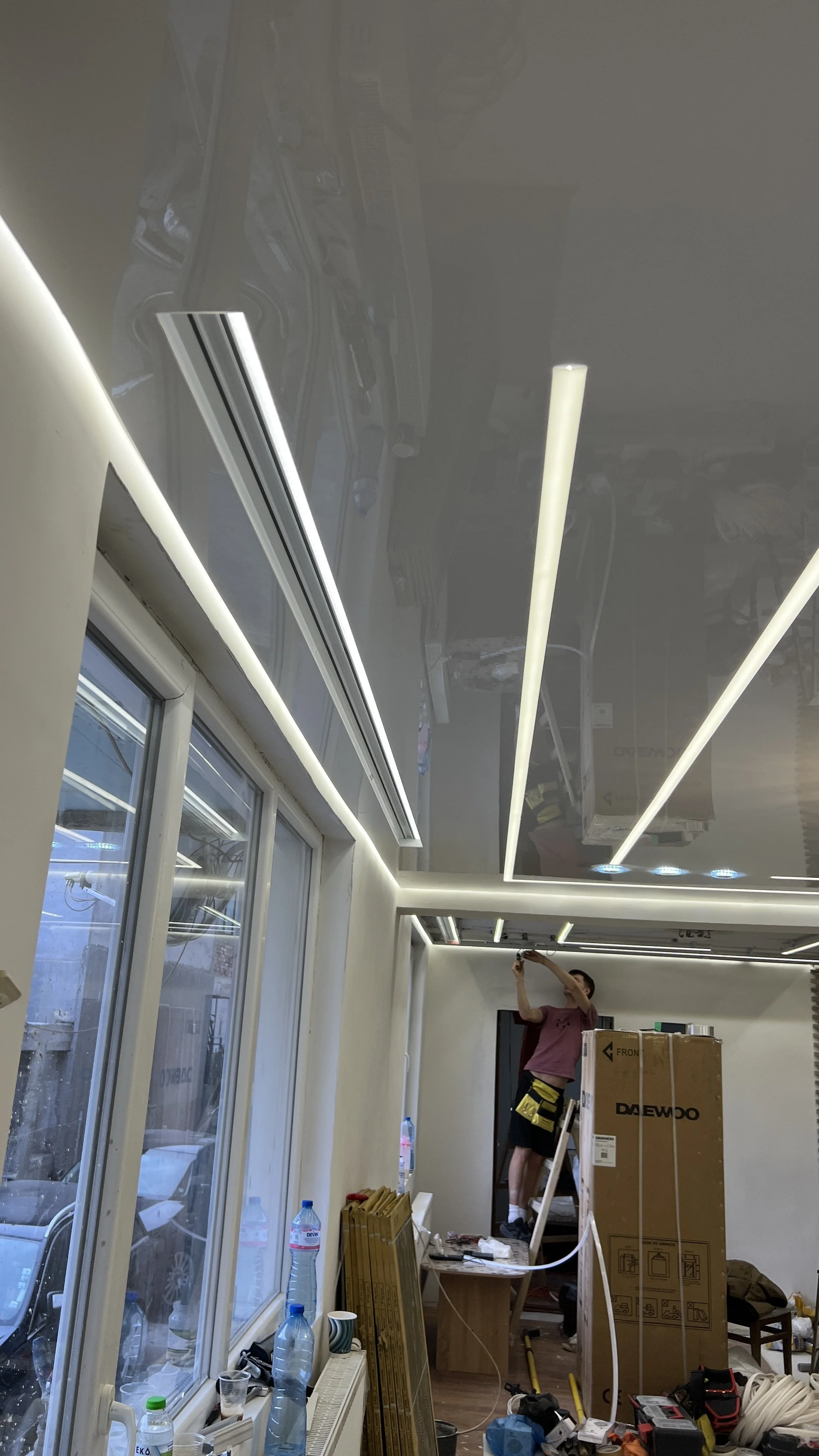 Представяме ви завършен обект: бял гланцов опънат таван със светови (светлинни) линии и плаващ профил за ефект „плаващ таван“. Лъскавата повърхност визуално разширява пространството, а shadow gap детайлът оформя чиста периферия и дизайнерски контур без видими крепежи.